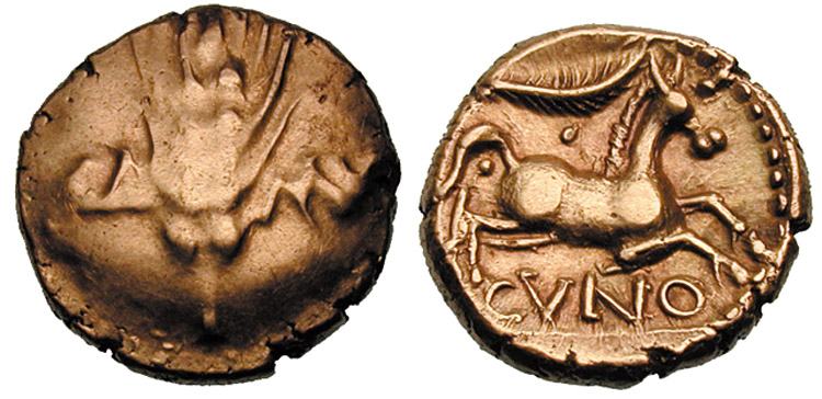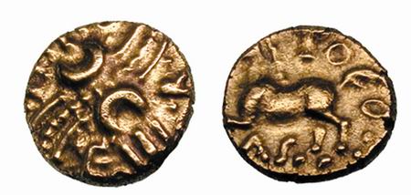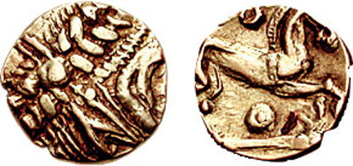| VA 1476 | Celtic Britain, Trinovantes AV Stater. ca 55-45 BC. Early Uninscribed L Gold, Whaddon Chase type. Celticized head of Apollo right / Celticized horse running right, wheel before, winged object and dot-triangle above, dot-in-ring below. Hobbs 306-328. | Text | Image |