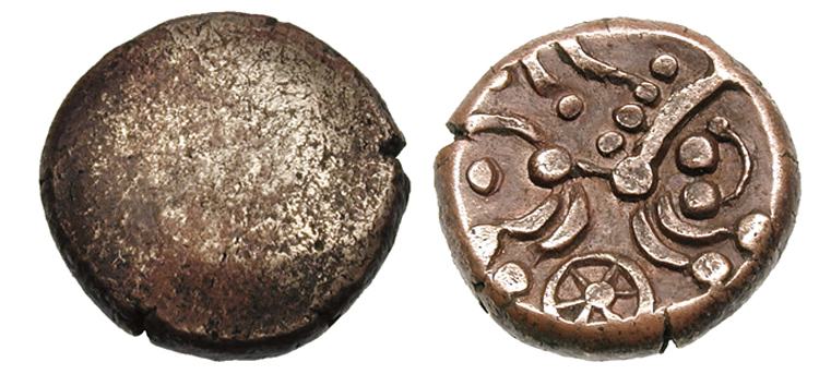 | VA 1526 | Celtic Britain, Trinovantes Base AV Stater. Savernake Forest type, ca. 40 BC. Blank / Highly Celticized horse right, spiral above, two dots and crescent before, wheel below. Hobbs 361. | Text | Image |