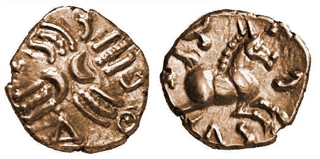 | VA 1478cf | Celtic, Trinovantes AV Quarter Stater. Whaddon Chase Type. Devolved head of Apollo right; two wings above the laurel wreath / Horse galloping right; winged annulet above, dot-in-annulet below. | Text | Image |