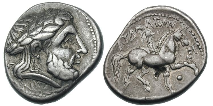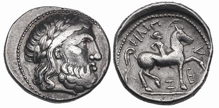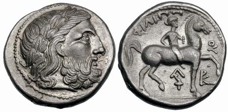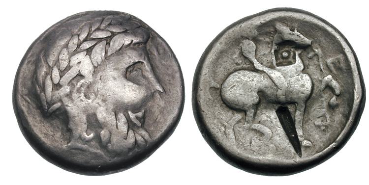 | Gobl 014•2cf | Early Imitation of Philip II AR Tetradrachm. Zeus / rider, with slightly blundered legend ΦΙΛΙΠ—OY, Z under horse’s belly, and E under raised foreleg. Cf Dessewffy 853 (obverse style).