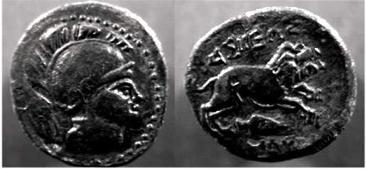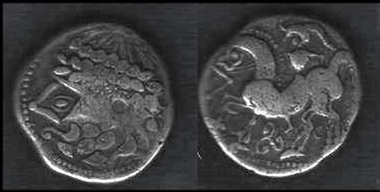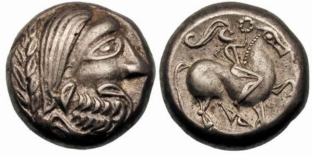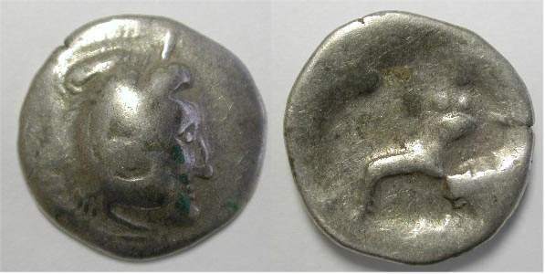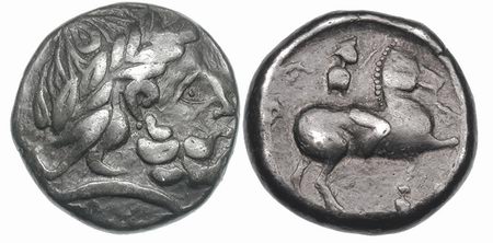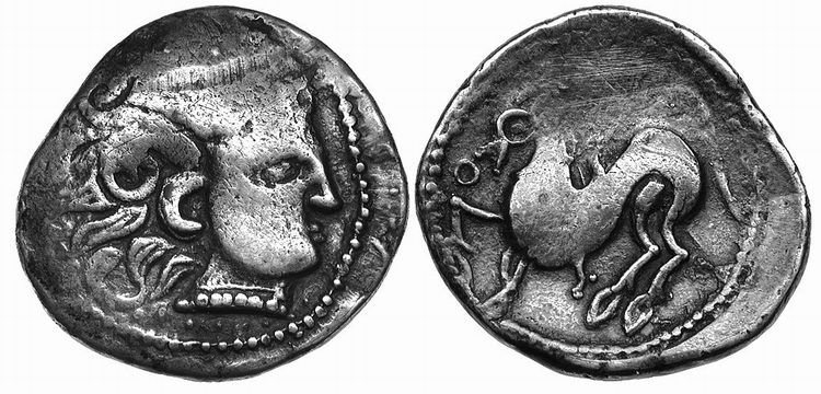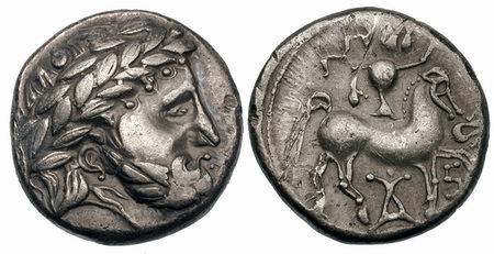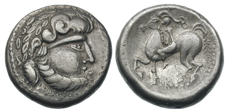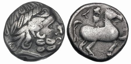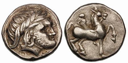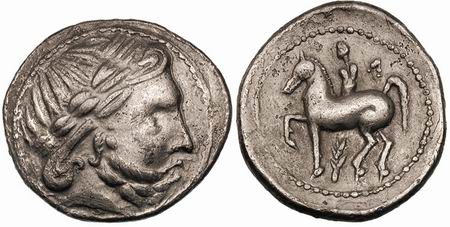 | Kapostral 4Drachm | Hercuniates Celts, (Hungarian plains) billon tetradrachm. Kapostral type, based on types of Philip II of Macedon, Laureate head of Zeus right. / Celticized horse and rider left, infinity sign below.