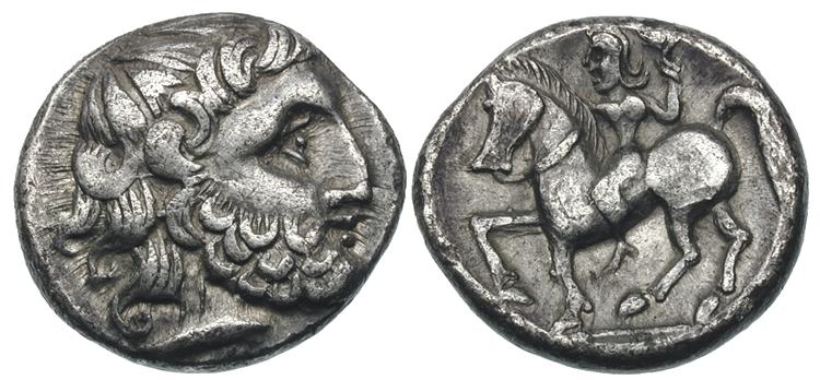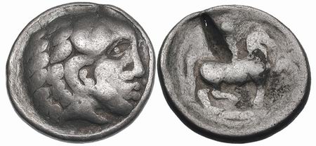| Gobl 112 | Early Imitation of Philip II AR Tetradrachm, Bartkranzavers (Zeus-Herakleskopf) type. Head of bearded Herakles right / Horseman trotting right.