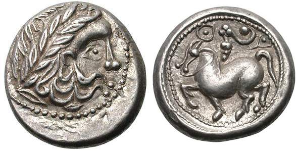 | Gobl 168 | Eastern Celts, Kranzreiter Type. Second–first century BC. AR tetradrachm. Laureate head of Zeus right, Celticized, with large lock of hair falling from forehead to ear in front of laurel wreath / Celticized horseman right with long crest, holding wreath, bow under horse. Göbl OTA 168.