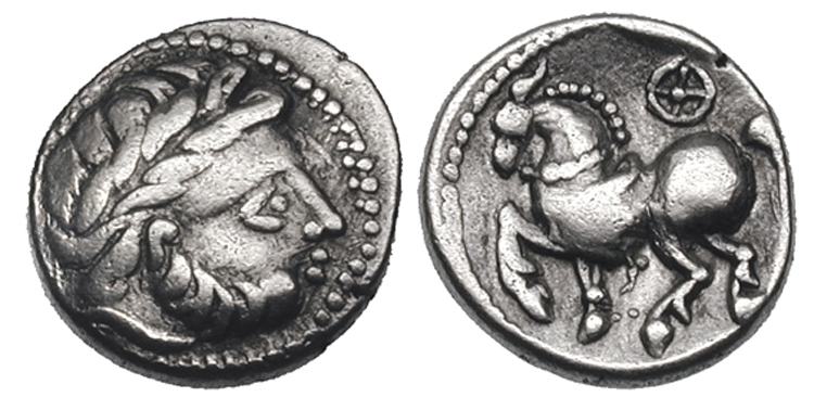 | Gobl 189•2 | East Celtic Fractional Coinage, AR Drachm. Dachreiter type. Laureate head of Zeus right / Horse trotting left, wheel above. Göbl OTA 189/2–3. Kostial 459.