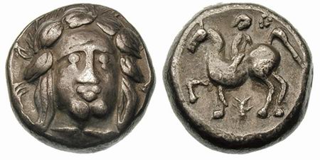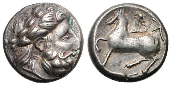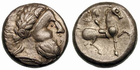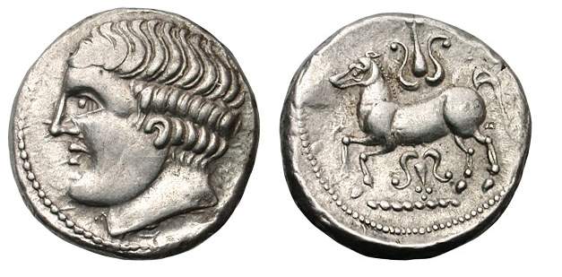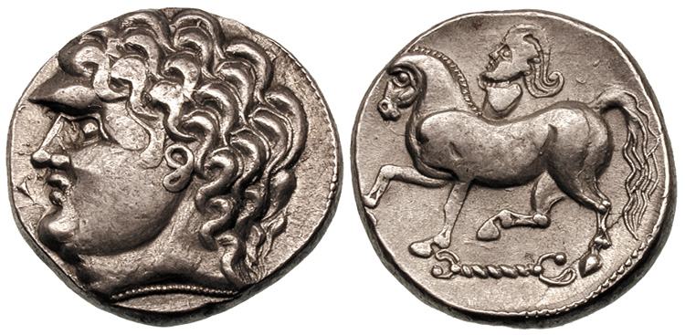 | Gobl 041•6v | Early Imitations of Philip II AR Tetradrachm. Laureate head of Zeus right, of local style / Nude jockey on horse prancing right.