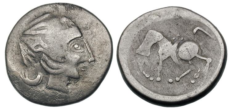 | Gobl 500 | East Celtic Fractional Coinage, AR Drachm. Kapostaler Kleingeld. Bearded head of Zeus right / Celticized horseman left, helmet crest above head. BMC Celtic 91–98. Göbl OTA 500.