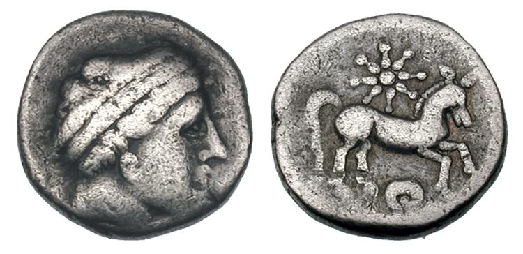 | Gobl 385 | East Celtic Fractional Coinage, AR Drachm. Drachm with star. Female head right, hair bound with broad band / Horse prancing right, sunburst above, pellet in ring below. Göbl OTA 385–386, BMC Celtic 150. | Text | Image |