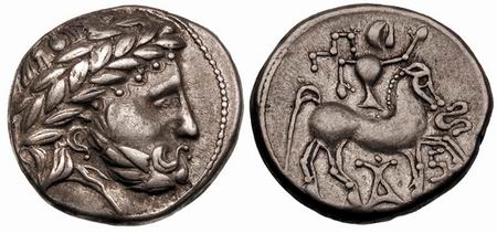 | Gobl 064•3 | Early Imitation of Philip II AR Tetradrachm, Dreifacher Perlkranz type. Head of Zeus right, with laurel wreath represented as triple row of pellets / Horseman with quadruple crest riding right, ring before horse. Castelin 1249, Kostial 387.