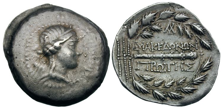 | Gobl 603•1 | Imitation of Macedonia 1st Region AR Tetradrachm. Macedonian shield with faint traces of ornaments, in tondo draped bust of Artemis right, in stephane, quiver over shoulder / ΜΑΚΕΔΟΝΩΝ ΠΡΩΤΗΣ above and below horizontal club, AYP monogram above, all within oak wreath, thunderbolt outside to left. Kostial 1008–1009.