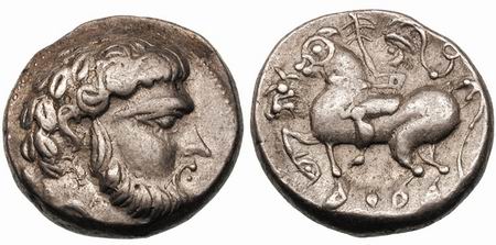 | Gobl 129•4 | Early Imitation of Philip II AR Tetradrachm, Baumreiter type. Laureate head of Zeus right / Helmeted horseman left with long crest ending in ring, holding branch in raised right hand, small animal in field before horse, leaf ornament on ground between legs. BMC Celtic 65–66, Kostial 416.