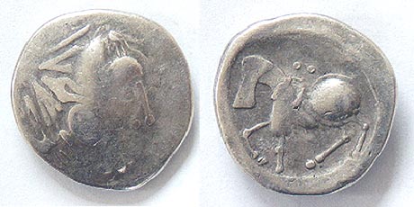 | Kroisback_Var | Eastern Celts. Burgenland. Kroisbach Type Variant. Second–first century BC. AR trihemiobol(?) (1.01 gm). Male head left with straight nose / Horse trotting left, wing above. Unpublished.