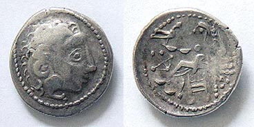 | Kostial_941cf | East Celts, Drachm. Head of Herakles wearing lionskin headdress / Zeus seated left.