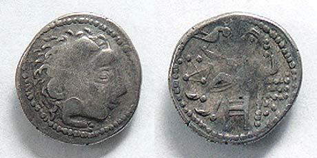 | Gobl 381•8 | Imitation of Audoleon AR Tetradrachm, Honter type. Laureate head of Zeus right / Horseman trotting right, ΛΕ before horse, Δ under raised foreleg, square countermark on horse’s neck. Kostial 690. | Text | Image |