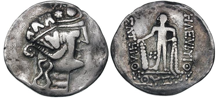 | Gobl 429 | Eastern Celts, Audoleon Monogram Type. Second century BC. AR tetradrachm. Laureate head of Zeus right, Celticized / Celticized horseman right, raising right hand, zigzag line behind head, lyre shape before horse, another zigzag under horse’s raised foreleg, monogram of Audoleon under horse’s belly. BMC Celtic 124ff, Kostial 723.