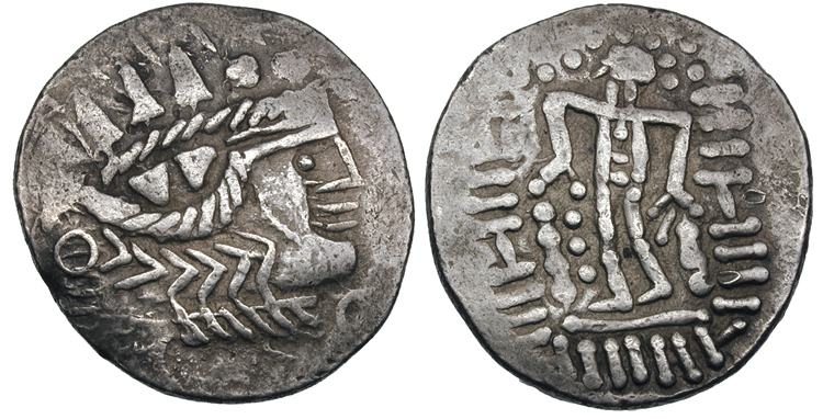 | Lucanc 1629 | Imitation of Thasos AR Tetradrachm. Devolved head of Dionysos / Herakles standing, legend reduced to meaningless dashes with a few pseudo-letters, and many pellets around Herakles’ head and in inner left field between club and leg. Lucanc 1629 and 1467 (both with same obverse die). Göbl OTA pl. 47–48, Class IV, cf. 7–8.