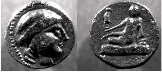 | sg1680 cf | Celtic imitation of Odessos, Thrace, Æ15. Helmeted head right / Great God reclining left.