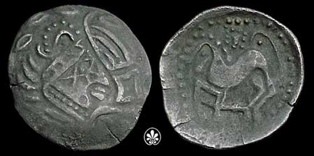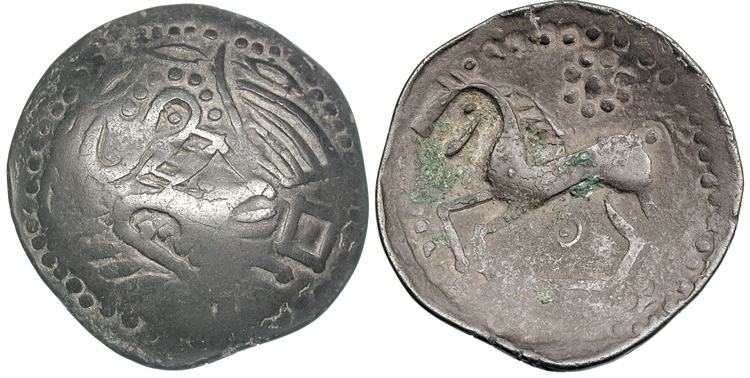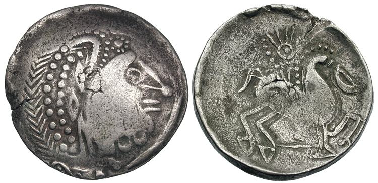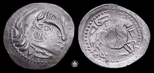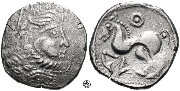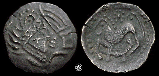 | Paris 9605 | Celtic, Transylvania. AR tetradrachm, curved bell metal. Celticized head of Zeus right, with hanging lower lip, wide collar, all within border of dots / Celticized horse right, rider represented by a crescent on narrow stem, mane represented by 7 dots; club below, PVI to right. Paris 9605-9608. | Text | Image |