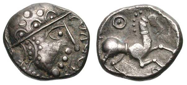 | CCCBM 284ff | Celtic Gaul, the Aedui, Kaletedou series, AR Quinarius. ca first century BC. Helmeted head of Roma left; X behind / Horse left.