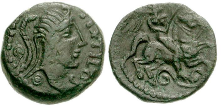 | DLT 7081 | Gaul: Aulerci Eburovices AE 15mm. PIXTILOS, Celticized diademed head of Apollo right; two dots in circles behind / Winged horseman riding right; spiral ornament below.