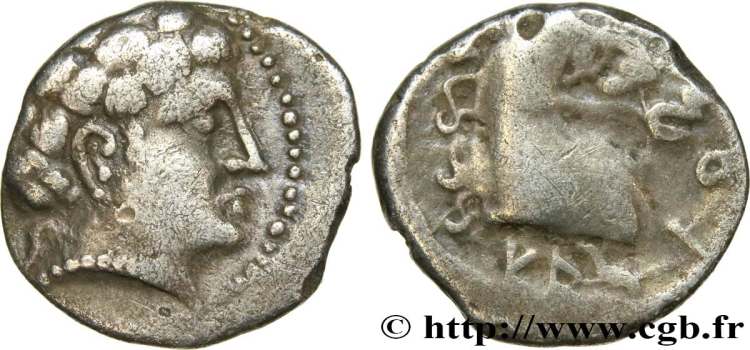 | BN 2524 | Cavarii AR denarius, type "KASIOS au buste de cheval". 125-100 BC. 14.5 mm, 2.38 g. Laureate male head right, wearing pearl necklace. / KASIOS (patrially retrograde), head and neck of horse right. Paris BN 2524-2527; Scheers L.131, SM.47 and D.27. | Text | Image |
