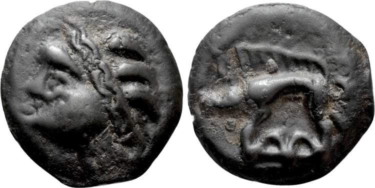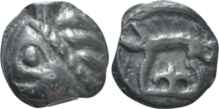 | Castelin 571f | Northwest Gaul, The Leuci, Potin 17mm. Diademed head left with locks of hair / boar standing left with wreath-like ornament below.