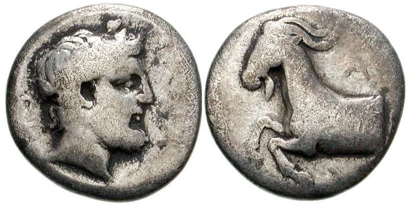 | BCD 386 | Aigeira, Achaia. Late 5th-early 4th century BC. AR Hemidrachm. 14mm, 2.58 g. Wreathed and bearded head of Dionysos right / Forepart of goat left. BCD Peloponnesos 386; SNG Copenhagen 125. | Text | Image |