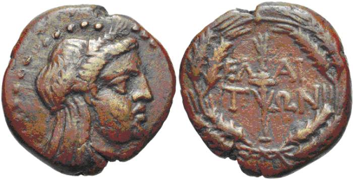 | BMC 23 | Elaea, Aeolis, AE15. 133 BC-AD 14. 3.8 g. Head of Demeter right, hair long, wreathed with corn. / E-ΛAI-T-ΩN in two lines to left and right of a torch within a wreath of corn. (Note the positions of the breaks in the legend). BMC 23. | Text | Image |