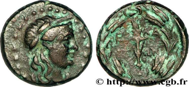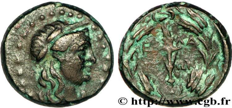 | Traité 2089 | Elaia, Aeolis, AE10, civic issue. ca. 300 BC. 1.16 g. Helmeted head of Athena left / E-Λ, barley corn within olive wreath, unclear monogram below. Babelon Traité 2089; Mionnet Supp. VI, 176. | Text | Image |