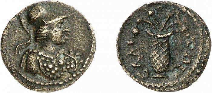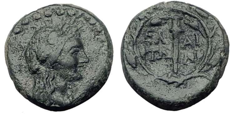 | SNG vA 7686 | Hadrian, AE16 of Elaea, Aeolis, 2.3g. AYTO TΡAI AΔΡI, laureate, draped, cuirassed bust right / EΛAITΩN, basket containing corn-ears and poppy heads. SNG v Aulock 7686. | Text | Image |