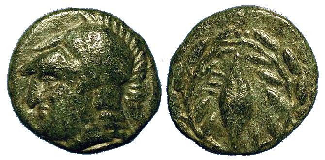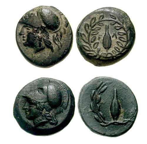 | SNG Cop 169 | Elaea, Aeolis. Ca 350-300 BC. AE 10mm. Helmeted head of Athena left / Barley-corn in olive wreath. | Text | Image | Text | Image | Text | Image |