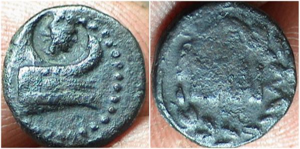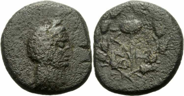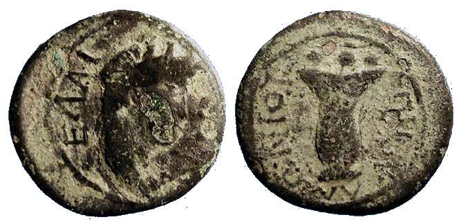 | RPC 2403 | Nero, AE17 of Elaea, Aeolis. AD 50-54. 3.18 gr. Magistrate Zenodotos. NERΩN KAIΣAΡ, bare head left / EΠI ZHNOΔOTOY EΛAITΩN, poppy. RPC 2403; SNG Stockholm 2200; Imhoof 2 in RSN 1905; Paris 301. | Text | Image |