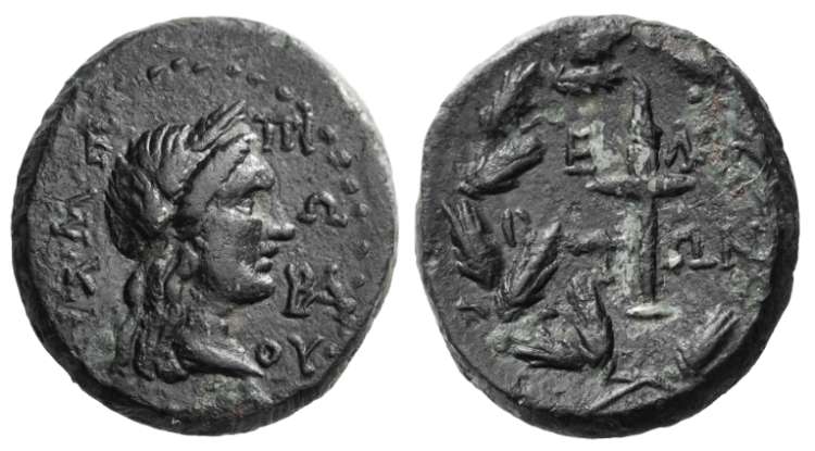 | RPC 2398 | Augustus, AE19 of Elaea, Aeolis. 27 BC-AD 14. Magistrate Mnesitheos. EΛAITΩN behind bare head of Augustus right / EΠI MNHΣIΘEOY in two lines across fields, poppy between two (sometimes three) corn-ears. RPC I 2398; Paris 299; Waddington 1324; Cienna 34778; AMC I 1260. | Text | Image |