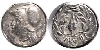 | SNG Cop 164 | Elaea, Aeolis, AR Hemiobol. Late 5th century BC. Archaic head of Athena left, in crested helmet / E-Λ-A-I around olive wreath, all within slightly incuse square. SNG Cop 164. | Text | Image |