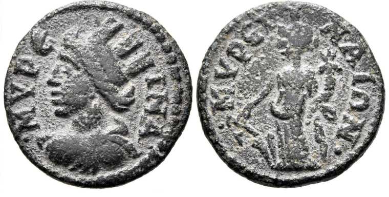 | BMC 41 | Myrina, Aeolis, AE17, Semi-autonomous, mid-3rd Century AD. MYΡE-INA, Turreted draped bust of Myrina left / MYΡEI-NAIΩN, Tyche standing left, holding rudder and cornucopiae. BMC 41, SNG Copenhagen 239, SNG Muenchen 590. | Text | ![]() |