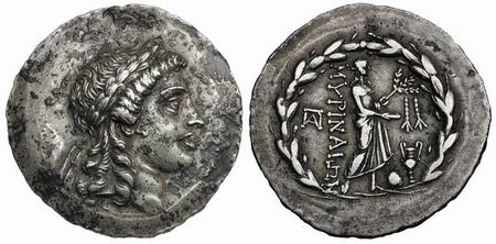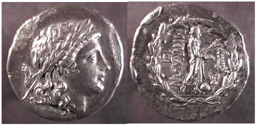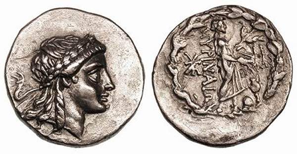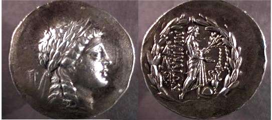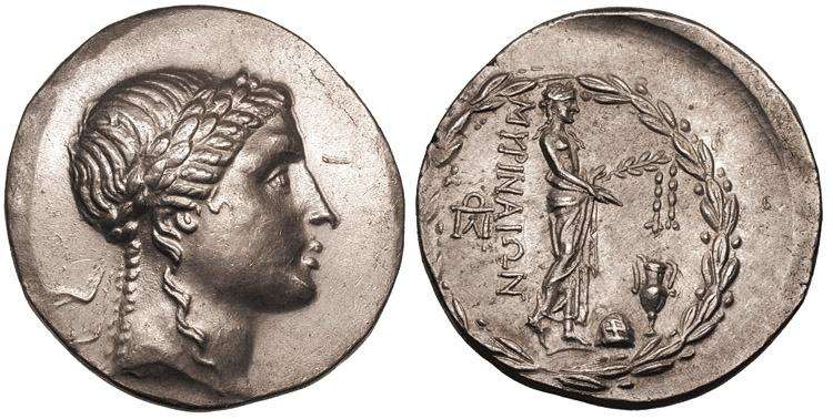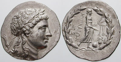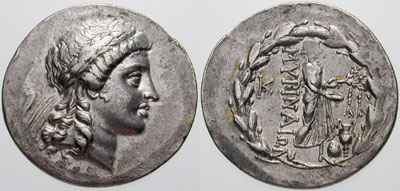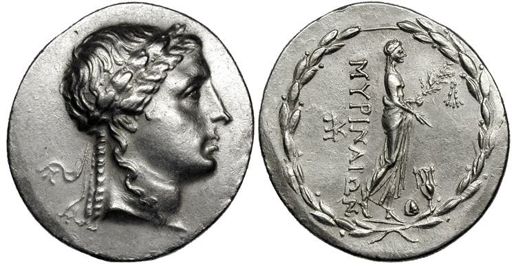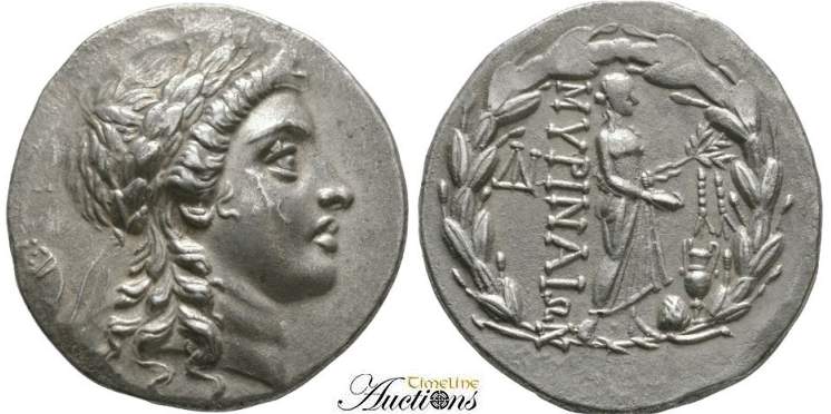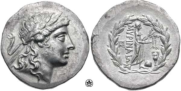 | Sacks 13cf | Myrina, Aeolis AR Tetradrachm. ca 155-150 BC. Laureate head of Apollo right, hair in three tight curls / MYΡINAIΩN, Apollo of Grynium standing right, holding phiale in right hand & filleted branch in left, omphalos & amphora before feet, ΠAE monogram in outer left field, all within laurel wreath. | Text | ![]() |