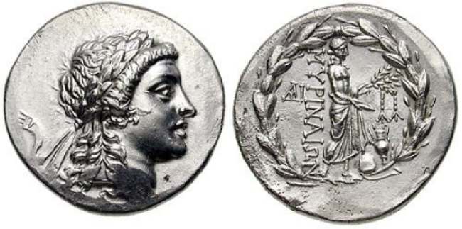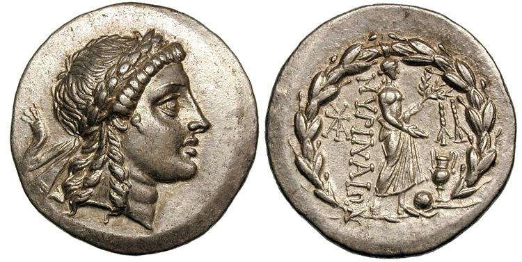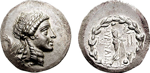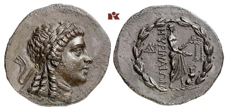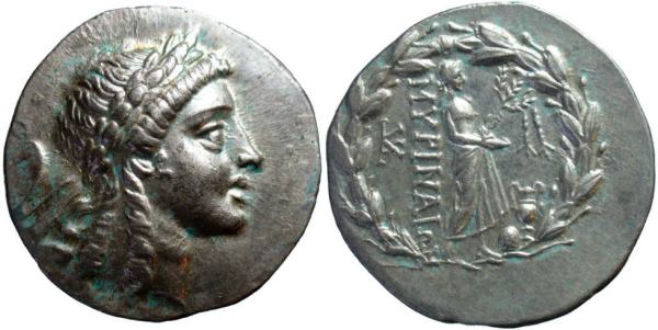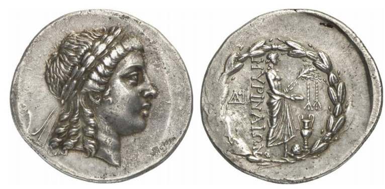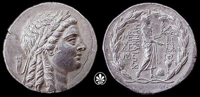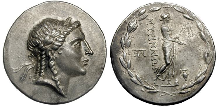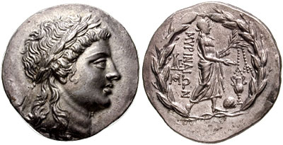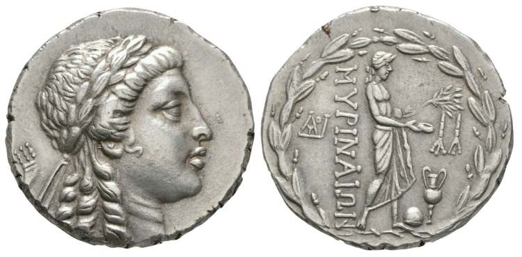 | SNG Cop 221 | Myrina. After 165 BC. AR Tetradrachm. Laureate head of Apollo right, hair in three loose braids / MYΡINAIΩN downwards to left of Apollo Grynios holding patera and filleted branch, omphalos and amphora at foot right; monogram left. | Text | ![]() |