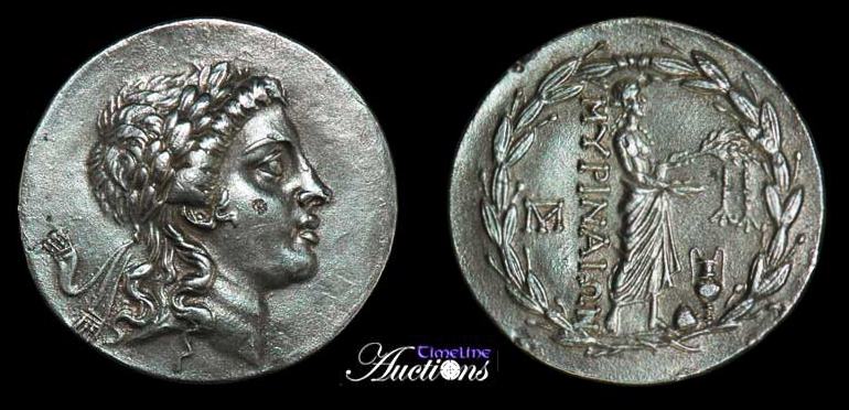 | Sacks 30 | Myrina, Aeolis AR Tetradrachm. ca 150-140 BC. Laureate head of Apollo right, hair in three loose braids / MYΡINAIΩN, Apollo of Grynium standing right, holding phiale in right hand & filleted branch in left, omphalos & amphora before feet, three monograms in outer left field (MEΠ above ΔYE above MΘ), all within laurel wreath. | Text Text | ![]() ![]() |