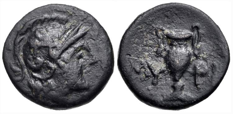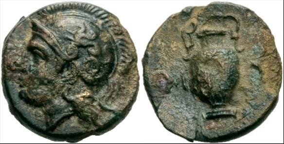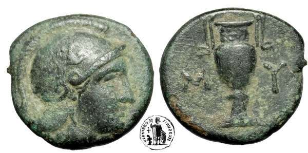 | BMC 26 | Myrina, Aeolis. AE15. 2nd-1st Century BC. 3.62 g. Head of Athena right, wearing Corinthian helmet decorated with griffin / M-Y, Amphora. BMC 26. | Text | ![]() |