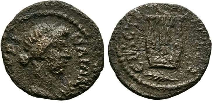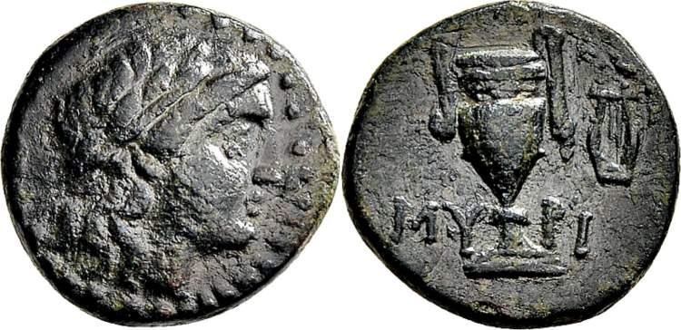 | SNG Cop 225 | Myrina, Aeolis. AE 17mm. Laureate head of Apollo right / MY-ΡA, decorated amphora; lyre right. SNG von Aulock 1666. | Text | ![]() |