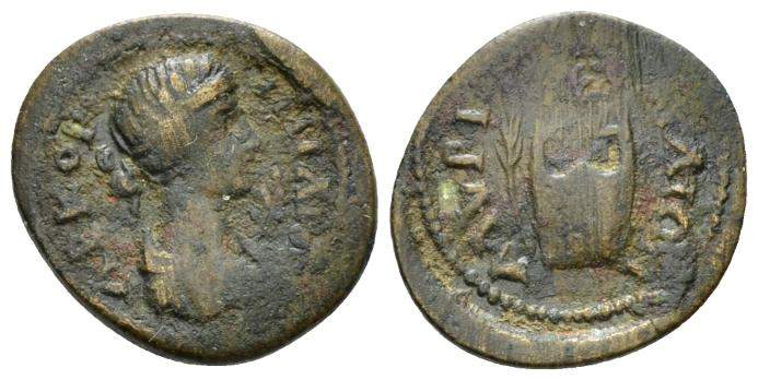 SNG Cop 242 | Faustina II AE 19 of Myrina, Aeolis. Magistrate Aristophanes, ΦAVCTINA CEBACTH, draped bust righ / EΠI M OYΛ AΡIΣTOΦA MYΡINAIΩN, Athena or Roma seated left, holding patera, spear and sword. SNG Cop 242; Greau 1736. | Text | ![]() |