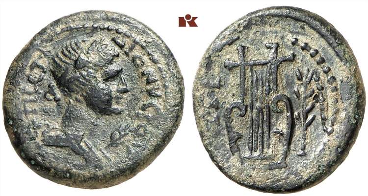 | RPC 964 | Domitian and Domitia, AE22 of Myrina, Aeolis. Magistrate Ae. Kleinias. AD 81-96. 5.39 g. AVTOKΡATOΡA ΔOMITIANON KAICAΡA, laureate head of Domitian right, facing draped bust of Domitia left. / EΠI KΛEINIOY AΡXONTOC around, M-Y Ρ-I across fields, Apollo standing front, holding branch and taenia. RPC II 964; SNG Munich 790; Mionnet Supp. VI, 243; Sestini Descr. 10. | Text | ![]() |