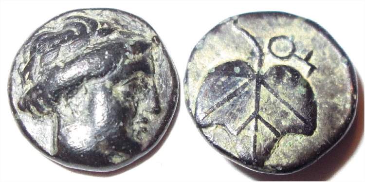 | Hunter 11 | Gongylos II, tyrant of Myrina and Gryneion. AE10. Uncertain mint, Myrina or Pergamon. Early Fourth Century BC. 1.14 g. Laureate head of Apollo right, hair rolled. / Ivy leaf, key-like monogram of Gongylos above. Hunter 11; Six 8 in NC XIV; SNG Turkey 9-III 1176-1179. | Text | ![]() |