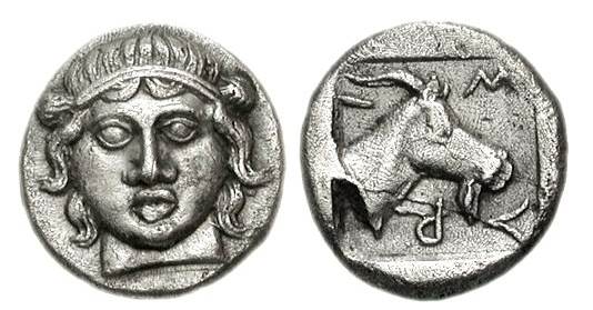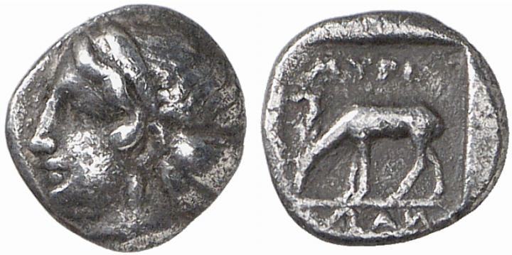 | NYS XVII, 77 | Myrina, Aeolis, AR Diobol. 1.09 gr. 420-380 BC. Head of female left, hair in a sakkos / MYΡI-NAΩN, Stag grazing left in incuse square. New York Sale, auction XVII, lot 77. | Text | ![]() |