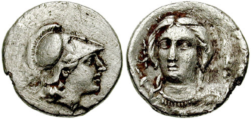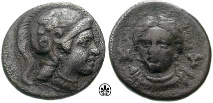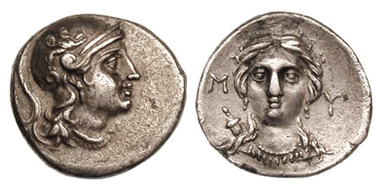 | SNG Cop 213 | Myrina, Aeolis. 4th Century BC. AR Hemidrachm (1.91 g). Head of Athena right, wearing Corinthian helmet decorated with Nike(?) / Head of Artemis three-quarters facing; M-Y in fields. | Text | ![]() |