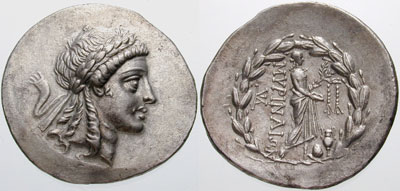 | Sacks 25 | Myrina, Aeolis AR Tetradrachm. After 165 BC. Laureate head of Apollo right, hair in three loose braids / MYΡINAIΩN, Apollo Grynios standing right holding patera and filleted branch; omphalos and amphora at foot right, ΔYΡ monogram behind; all within a laurel wreath. | Text | ![]() |
