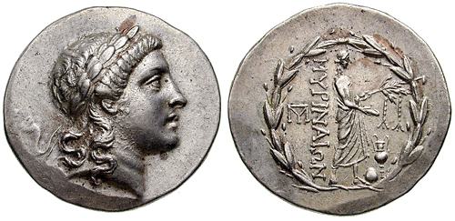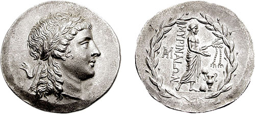 | Sacks 23 | Myrina, Aeolis, AR Tetradrachm. Civic type ca. 160–145 BC. Laureate head of Apollo right, three loose braids / MYΡINAIΩN, Apollo standing right, holding patera and filleted branch; omphalos and amphora at feet, ΔYI monogram to left, all within laurel wreath. Sacks 23; BMC 8. | Text | ![]() |