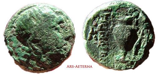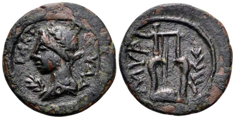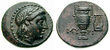 | SNG vA 7706 | Myrina, Aeolis, AE 15mm; 4.1g. 200-0 BC. Laureate head of Apollo right / MYΡINAIΩN, Amphora, lyre to right. SNG von Aulock 7706. | Text | ![]() |