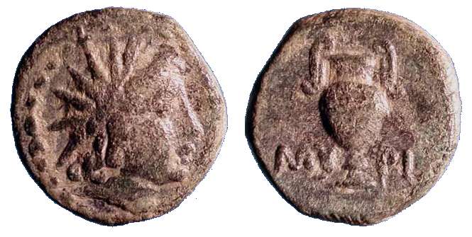 | SNG Cop 226 | Myrina, Aeolis. AE 13mm. Civic issue. 200-25 BC. Radiate head of Helios right / MY-ΡI across fields at the base of an amphora. SNG Cop 226; Weber 5570; BMC 32; Lindgren I 412. | Text | ![]() |