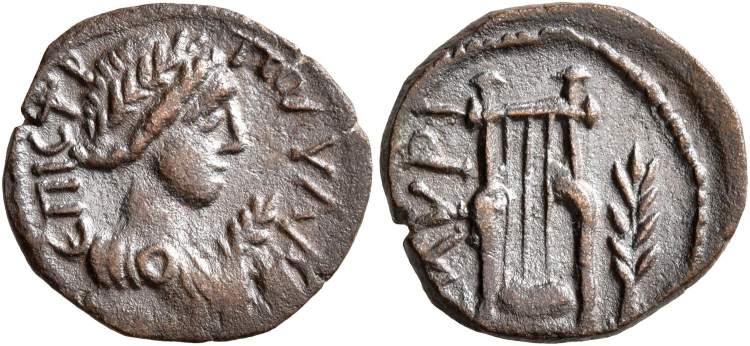 | Winterthur 2848 | Myrina, Aeolis, AE17 semi-autonomous issue, AD 100-200. 2.63 g. Magistrate Polydas. EΠI CTΡ ΠOΛYΔA, Laureate head of Apollo left, branch before neck. / MYΡI to left of lyre, upright palm branch to right. Winterthur 2848; Paris 380; Imhoof GRM 88 in RSN 19; Leypold I, 533. | Text | ![]() |