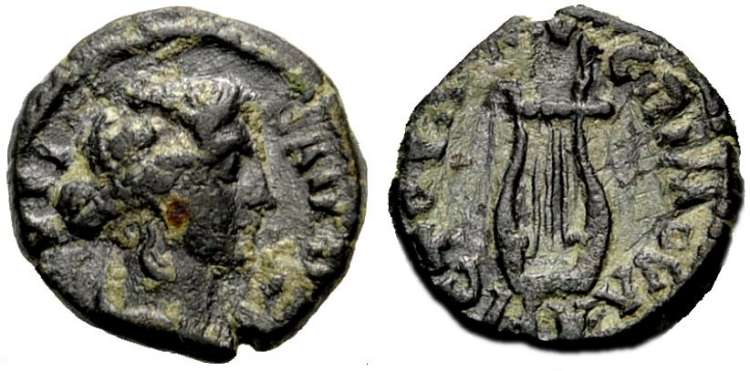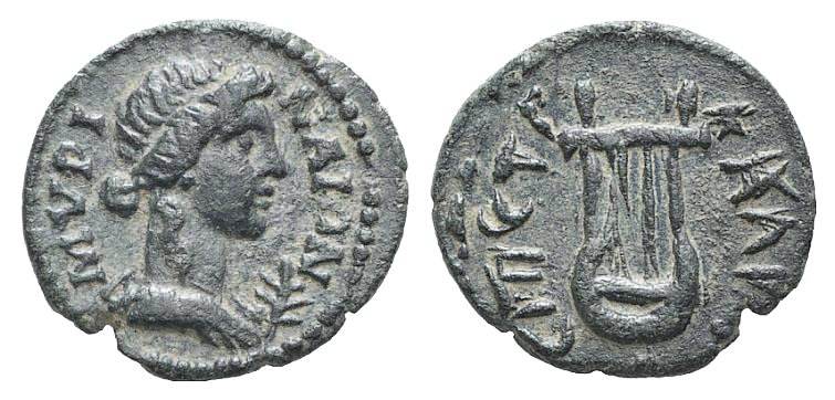| SNG Righetti 823 | Myrina, Aeolis AE15, semi-autonomous issue. AD 100-200. Magistrate Polyda. 1.98 g. EΠI CTΡ ΠOΛYΔA, laureate head of Apollo right, laurel branch before head. / MYΡI, lyre, upright laurel branch in right field. SNG Righetti 823; SNG Cop 231; Vienna GR34779; SNG Munich 582-583. | Text | ![]() |